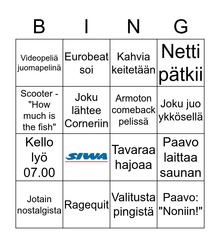 This bingo card has 2 images and 19 words: Paavo laittaa saunan, Makkaraa paistetaan, Kahvia keitetään, loppu, Jotain nostalgista, Scooter - "How much is the fish", Ragequit, Videopeliä juomapelinä, Kello lyö 07.00, Eurobeat soi, Tavaraa hajoaa, Joku lähtee Corneriin, Paavo: "Noniin!", Armoton comeback pelissä, Joku ottaa tiukempia, Joku juo ykkösellä, Netti pätkii, Valitusta pingistä and Kello lyö 04.00.