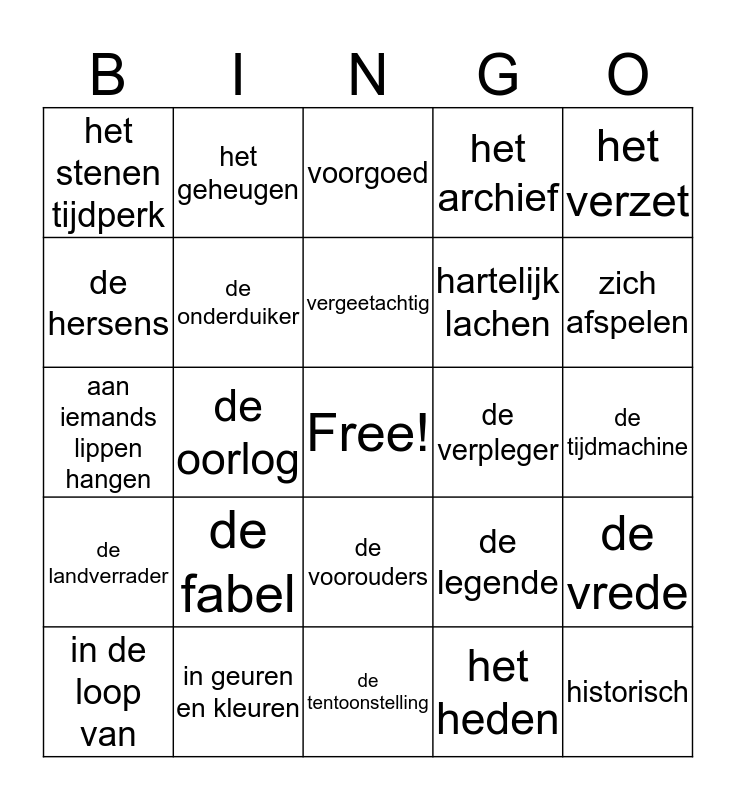 This bingo card has a free space and 34 words: het verleden, het heden, de toekomst, de samenleving, de landverrader, de onderduiker, het verzet, in de loop van, het geheugen, de herinnering, vergeetachtig, voorgoed, tijdelijk, het schroot, de verpleger, zich afspelen, in geuren en kleuren, aan iemands lippen hangen, de fabel, de legende, de voorouders, het nageslacht, het stenen tijdperk, de tijdmachine, de tentoonstelling, historisch, het archief, stilstaan bij iets, hartelijk lachen, de hersens, allereerst, de oorlog, de vrede and de ellende.