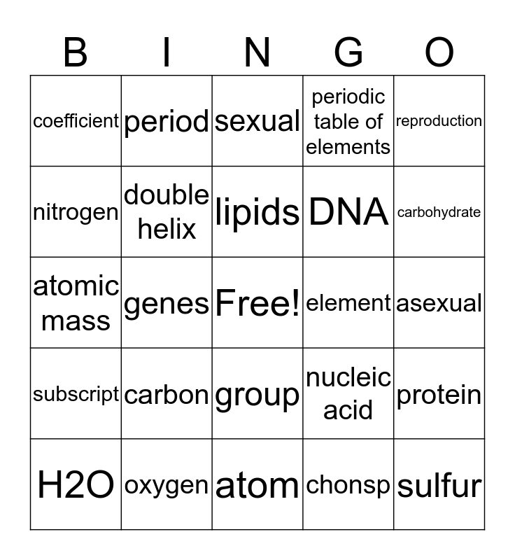 This bingo card has a free space and 24 words: carbon, oxygen, lipids, H2O, reproduction, coefficient, nitrogen, period, element, group, DNA, atomic mass, nucleic acid, protein, double helix, chonsp, asexual, sexual, carbohydrate, genes, sulfur, subscript, periodic table of elements and atom.