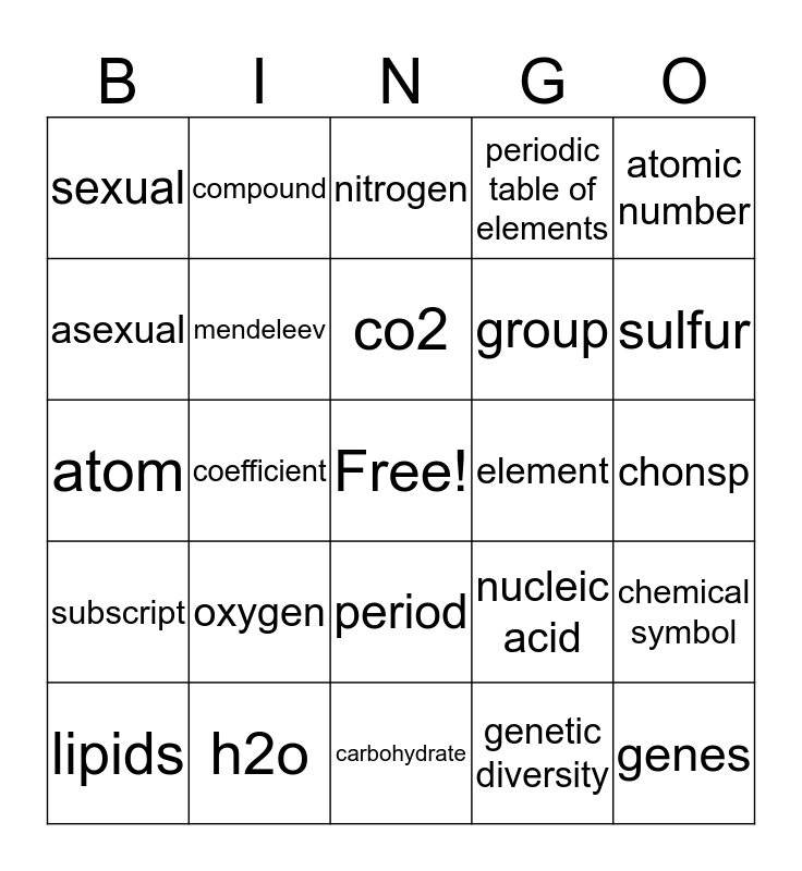 This bingo card has a free space and 24 words: oxygen, h2o, co2, lipids, atomic number, sexual, asexual, compound, element, period, group, atom, nucleic acid, chemical symbol, mendeleev, genetic diversity, chonsp, nitrogen, sulfur, coefficient, genes, subscript, periodic table of elements and carbohydrate.