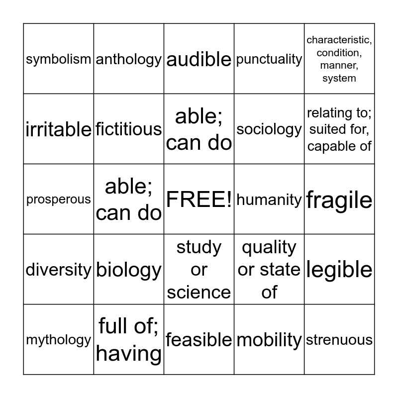 This bingo card has a free space and 24 words: biology, full of; having, able; can do, mythology, characteristic, condition, manner, system, symbolism, irritable, anthology, humanity, study or science, sociology, prosperous, quality or state of, legible, fictitious, mobility, fragile, audible, relating to; suited for, capable of, able; can do, strenuous, diversity, punctuality and feasible.