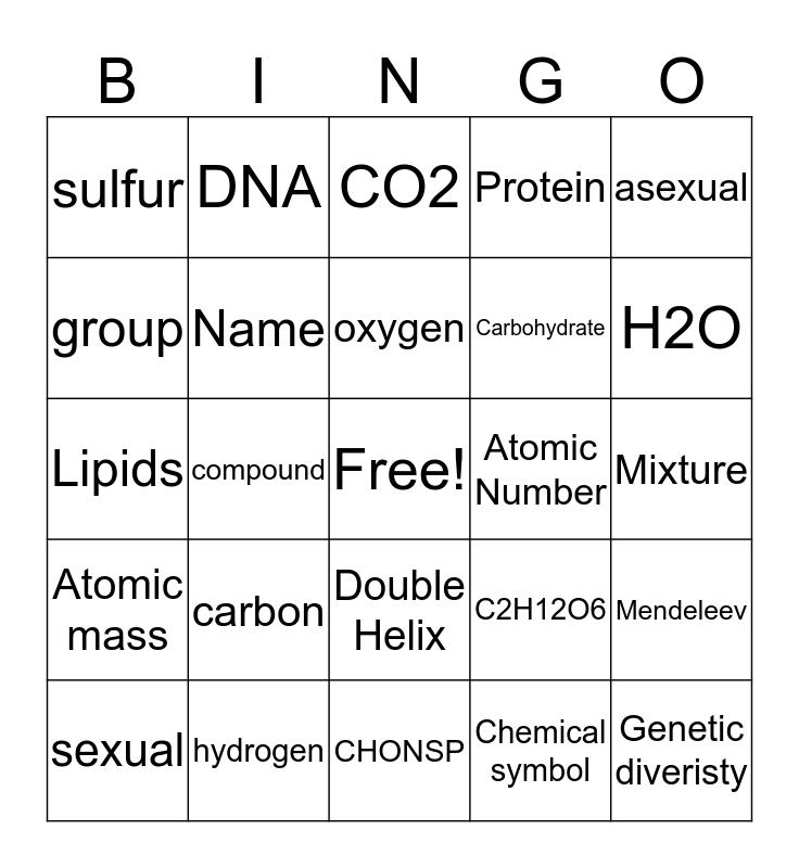 This bingo card has a free space and 24 words: carbon, hydrogen, oxygen, sexual, asexual, sulfur, group, DNA, Atomic Number, Double Helix, Carbohydrate, Lipids, C2H12O6, Mendeleev, Name, Chemical symbol, Mixture, CO2, H2O, compound, Genetic diveristy, Atomic mass, Protein and CHONSP.