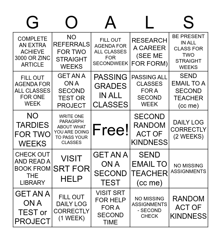 This bingo card has a free space and 24 words: VISIT SRT FOR HELP, FILL OUT DAILY LOG CORRECTLY (1 WEEK), PASSING GRADES IN ALL CLASSES, GET AN A ON A TEST or PROJECT, BE PRESENT IN ALL CLASS FOR TWO STRAIGHT WEEKS, COMPLETE AN EXTRA ACHIEVE 3000 OR ZINC ARTICLE, FILL OUT AGENDA FOR ALL CLASSES FOR ONE WEEK, NO REFERRALS FOR TWO STRAIGHT WEEKS, SECOND RANDOM ACT OF KINDNESS, GET AN A ON A SECOND TEST, PASSING ALL CLASSES FOR A SECOND WEEK, NO TARDIES FOR TWO WEEKS, SEND EMAIL TO TEACHER (cc me), NO MISSING ASSIGNMENTS, GET AN A ON A SECOND TEST OR PROJECT, NO MISSING ASSIGNMENTS - SECOND CHECK, DAILY LOG CORRECTLY (2 WEEKS), FILL OUT AGENDA FOR ALL CLASSES FOR SECONDWEEK, SEND EMAIL TO A SECOND TEACHER (cc me), WRITE ONE PARAGRPH ABOUT WHAT YOU ARE DOING TO PASS YOUR CLASSES, RANDOM ACT OF KINDNESS, CHECK OUT AND READ A BOOK FROM THE LIBRARY, RESEARCH A CAREER (SEE ME FOR FORM) and VISIT SRT FOR HELP FOR A SECOND TIME.