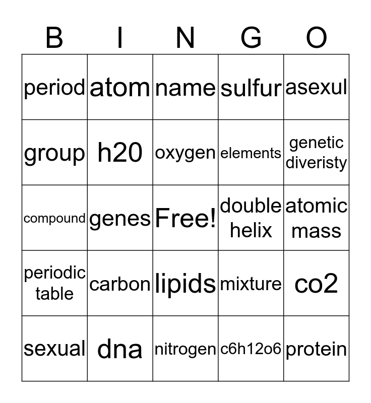 This bingo card has a free space and 24 words: carbon, dna, oxygen, sexual, asexul, period, group, atom, double helix, lipids, elements, compound, mixture, co2, h20, c6h12o6, atomic mass, name, genetic diveristy, genes, protein, periodic table, sulfur and nitrogen.