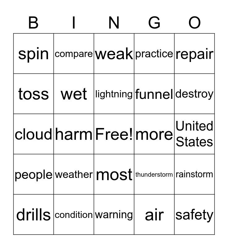 This bingo card has a free space and 24 words: weather, condition, lightning, drills, repair, spin, toss, compare, more, most, funnel, cloud, thunderstorm, rainstorm, wet, air, United States, weak, destroy, harm, safety, people, practice and warning.