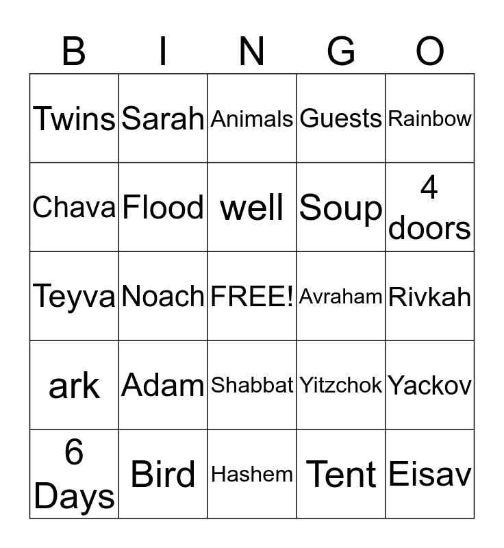 This bingo card has a free space and 24 words: Adam, Bird, well, 6 Days, Rainbow, Twins, Chava, Sarah, Avraham, Shabbat, Soup, Teyva, Yitzchok, Yackov, Flood, Tent, Rivkah, Animals, 4 doors, Noach, Eisav, ark, Guests and Hashem.