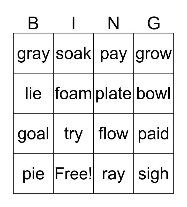 This bingo card has 31 words: rain, wait, paid, mail, gray, pay, plate, rake, Free!, air, ray, pie, fries, fly, try, light, high, flight, sigh, cry, lie, road, coat, soak, goal, foam, grow, flow, blow, bowl and slow.