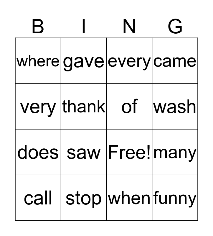 This bingo card has 19 words: Free!, any, every, funny, many, very, when, where, gave, does, saw, thank, of, stop, call, black, came, wash and red.