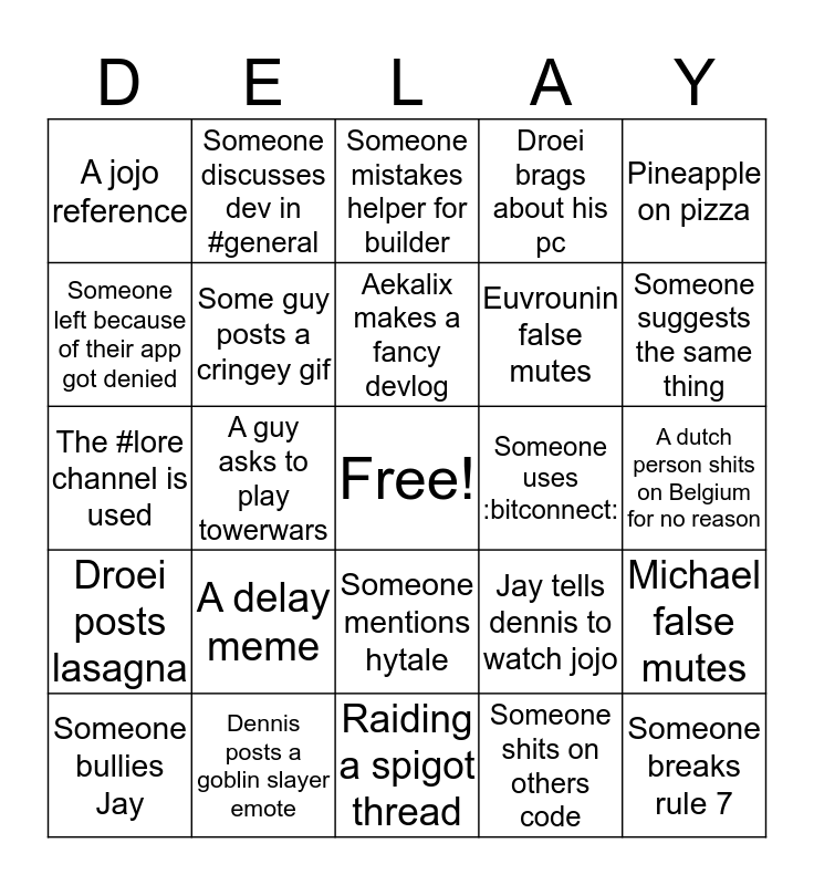 This bingo card has a free space and 24 words: Someone bullies Jay, A delay meme, Aekalix makes a fancy devlog, Someone shits on others code, Pineapple on pizza, A jojo reference, Someone discusses dev in #general, Someone mistakes helper for builder, Someone uses :bitconnect:, A dutch person shits on Belgium for no reason, The #lore channel is used, Some guy posts a cringey gif, Jay tells dennis to watch jojo, Michael false mutes, Someone left because of their app got denied, Dennis posts a goblin slayer emote, Raiding a spigot thread, Droei brags about his pc, Someone suggests the same thing, Droei posts lasagna, A guy asks to play towerwars, Someone mentions hytale, Euvrounin false mutes and Someone breaks rule 7.