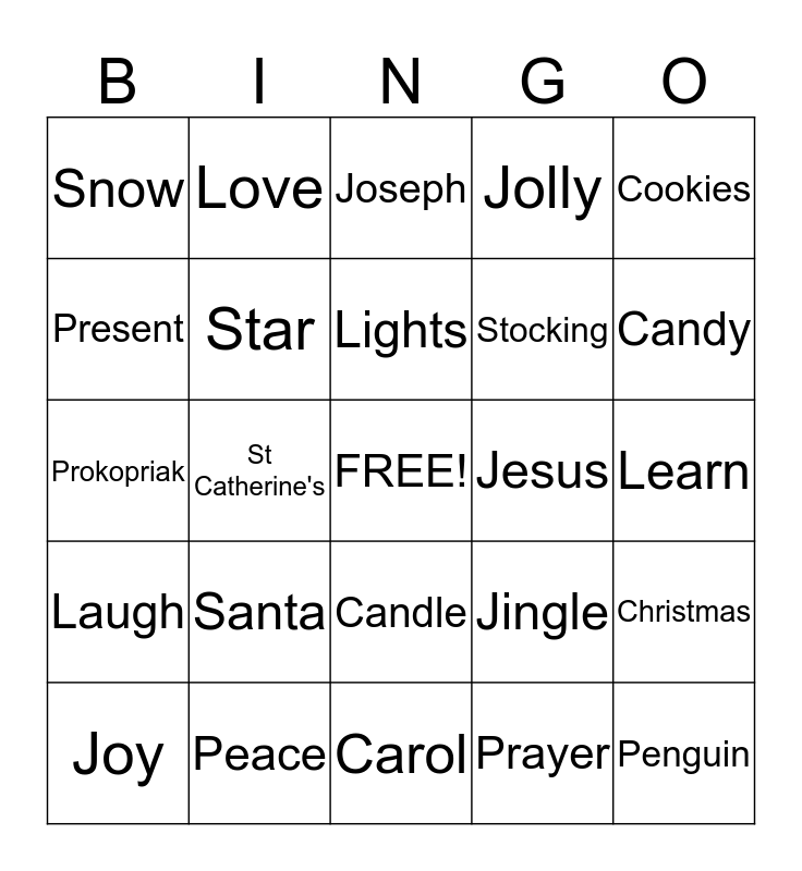 This bingo card has a free space and 24 words: Santa, Peace, Lights, Joy, Cookies, Snow, Present, Love, Jesus, Candle, Stocking, Prokopriak, Jingle, Christmas, Star, Prayer, Learn, Joseph, Candy, St Catherine's, Penguin, Laugh, Jolly and Carol.