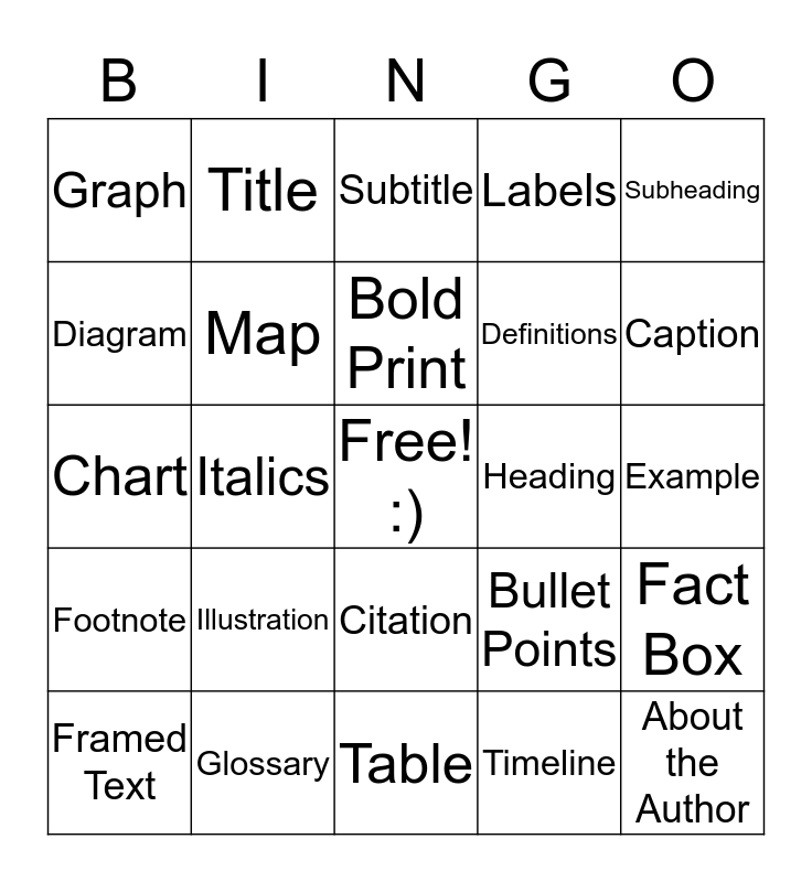 This bingo card has a free space and 25 words: Illustration, Table, Bold Print, Framed Text, Subheading, Graph, Diagram, Title, Heading, Citation, Definitions, Chart, Bullet Points, Fact Box, Map, Table of Contents, Example, Subtitle, Caption, Italics, About the Author, Glossary, Footnote, Labels and Timeline.