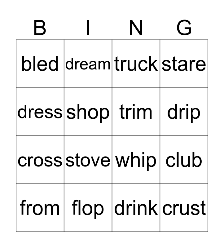 This bingo card has 20 words: club, drop, truck, slot, from, dress, flop, bled, cross, dream, stove, whip, shop, crust, trim, slim, drip, stare, drink and trip.