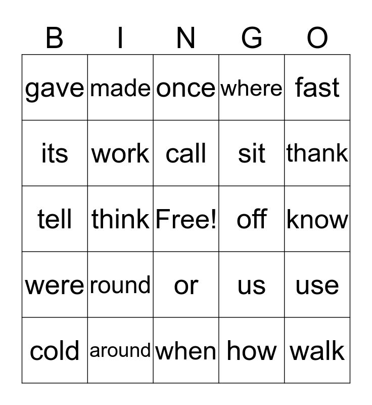 This bingo card has a free space and 24 words: round, around, call, cold, fast, gave, its, made, off, or, sit, tell, us, use, work, how, know, once, thank, think, walk, were, where and when.