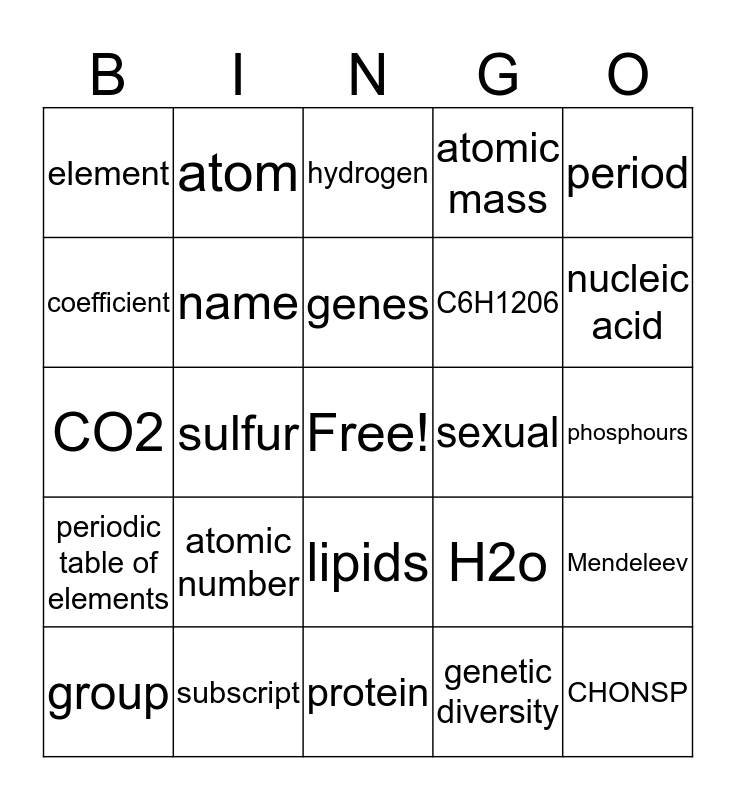 This bingo card has a free space and 24 words: atomic number, subscript, genes, group, period, element, coefficient, atom, sexual, lipids, C6H1206, CO2, H2o, Mendeleev, name, genetic diversity, phosphours, hydrogen, nucleic acid, sulfur, CHONSP, periodic table of elements, atomic mass and protein.
