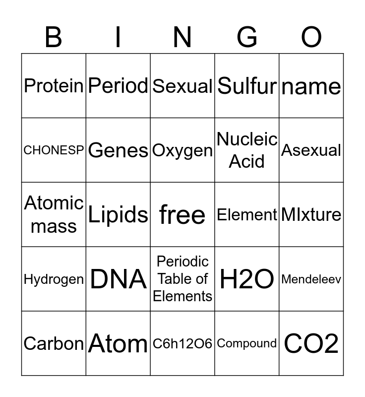 This bingo card has a free space and 24 words: DNA, Atom, Oxygen, Carbon, name, Protein, CHONESP, Period, Element, Periodic Table of Elements, Nucleic Acid, Atomic mass, H2O, Mendeleev, Genes, Compound, MIxture, Sexual, Asexual, Lipids, CO2, Hydrogen, Sulfur and C6h12O6.