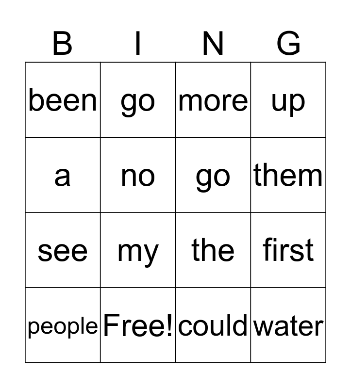 This bingo card has 30 words: my, than, first, water, been, more, go, see, Free!, no, could, people, a, the, my, than, first, water, been, a, the, more, go, see, no, up, will, like, them and many.