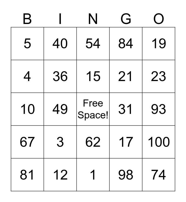 This bingo card has a free space and 24 words: 3, 12, 15, 81, 19, 5, 4, 40, 31, 62, 21, 10, 17, 100, 36, 98, 93, 54, 23, 49, 74, 67, 84 and 1.