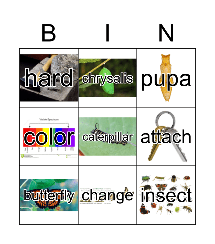 This bingo card has 11 images and 11 words: insect, change, caterpillar, butterfly, chrysalis, pupa, attach, born, color, hard and sequence.