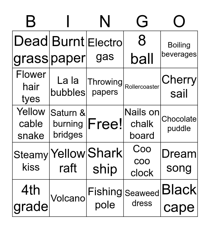 This bingo card has a free space and 25 words: Yellow raft, Fishing pole, Throwing papers, 4th grade, Boiling beverages, Dead grass, Flower hair tyes, Burnt paper, Nails on chalk board, Shark ship, Rollercoaster, Yellow cable snake, Coo coo clock, Dream song, La la bubbles, Car 85, Chocolate puddle, Electro gas, Cherry sail, Saturn & burning bridges, Black cape, Volcano, Steamy kiss, 8 ball and Seaweed dress.