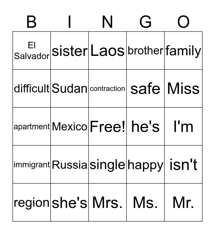 This bingo card has a free space and 29 words: region, country, Mexico, Somalia, El Salvador, Laos, Sudan, Russia, he's, she's, I'm, Mr., Mrs., Ms., Miss, married, single, immigrant, family, apartment, happy, sad, safe, difficult, brother, sister, isn't, contraction and article.