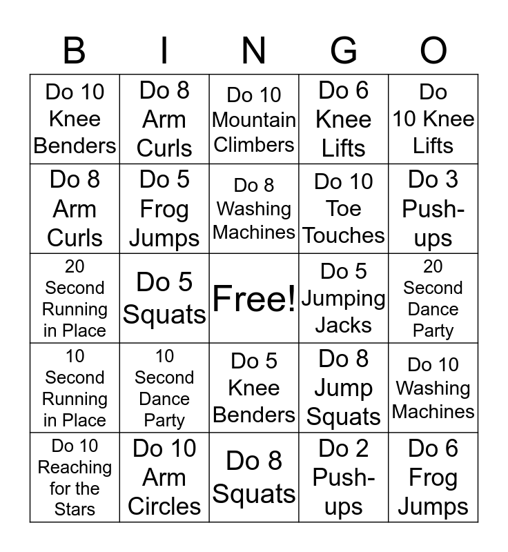 This bingo card has a free space and 29 words: Do 10 Reaching for the Stars, Do 10 Jumping Jacks, Do 5 Squats, Do 5 Jump Squats, Do 10 Knee Benders, Do 10 Mountain Climbers, Do 5 Frog Jumps, 10 Second Dance Party, Do 5 Jumping Jacks, Do 10 Arm Circles, 20 Second Dance Party, Do 6 Frog Jumps, Do 8 Squats, Do 2 Push-ups, Do 3 Push-ups, Do 5 Toe Touches, Do 5 Knee Benders, 10 Second Running in Place, Do 10 Knee Lifts, 20 Second Running in Place, Do 8 Jump Squats, Do 10 Arm Curls, Do 10 Toe Touches, Do 8 Arm Curls, Do 6 Knee Lifts, Do 8 Arm Curls, Do 10 Washing Machines, Do 8 Washing Machines and Do 10 Toe Touches.