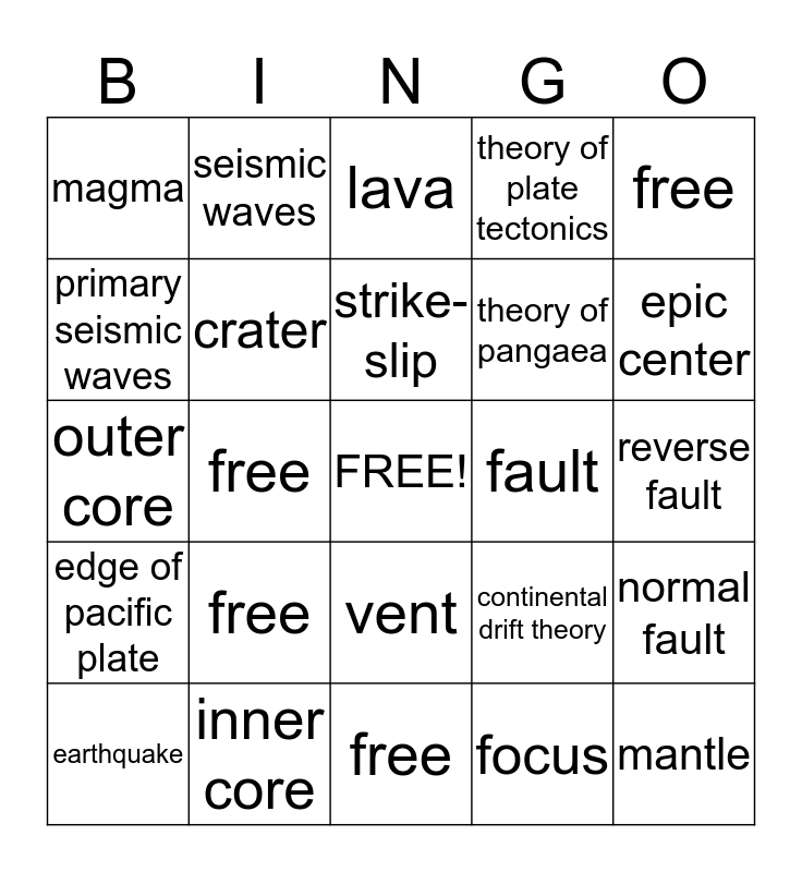 This bingo card has a free space and 24 words: free, inner core, strike-slip, earthquake, free, magma, primary seismic waves, seismic waves, fault, vent, theory of pangaea, outer core, continental drift theory, normal fault, crater, focus, reverse fault, lava, epic center, free, mantle, edge of pacific plate, theory of plate tectonics and free.