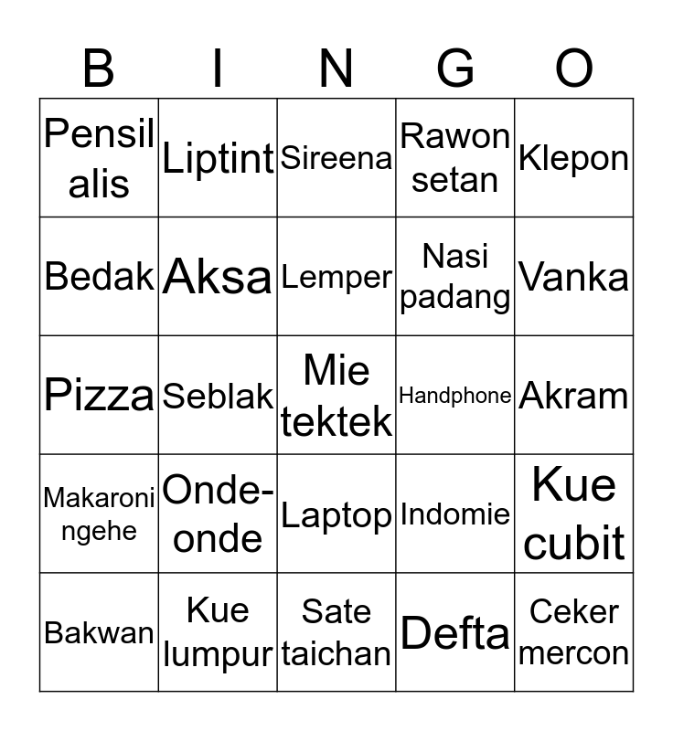 This bingo card has a free space and 24 words: Onde-onde, Kue lumpur, Lemper, Bakwan, Klepon, Pensil alis, Bedak, Liptint, Handphone, Laptop, Nasi padang, Pizza, Indomie, Kue cubit, Aksa, Defta, Akram, Sireena, Vanka, Seblak, Ceker mercon, Makaroni ngehe, Rawon setan and Sate taichan.