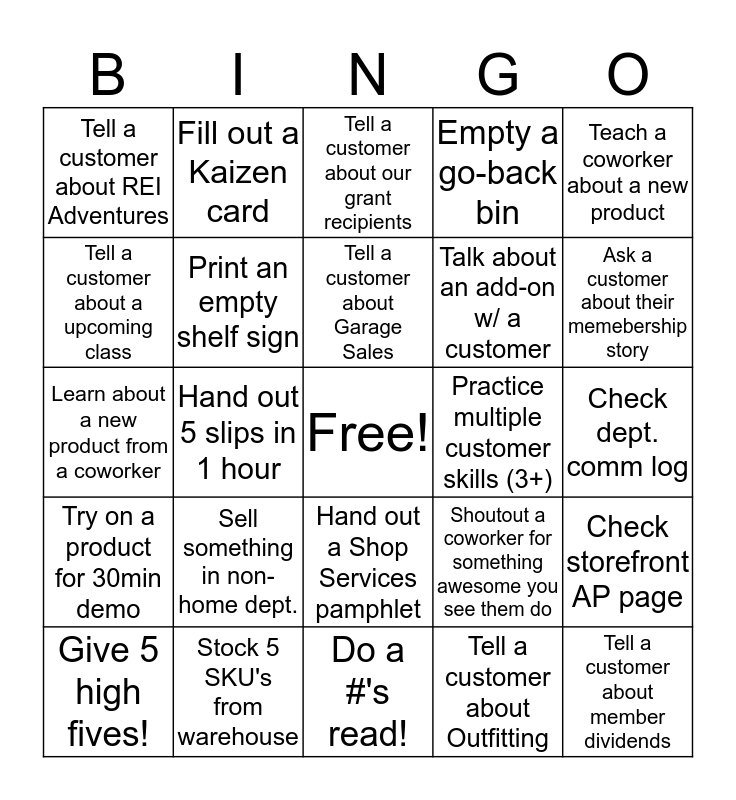 This bingo card has a free space and 24 words: Sell something in non-home dept., Stock 5 SKU's from warehouse, Tell a customer about Garage Sales, Give 5 high fives!, Teach a coworker about a new product, Tell a customer about REI Adventures, Tell a customer about a upcoming class, Fill out a Kaizen card, Practice multiple customer skills (3+), Hand out a Shop Services pamphlet, Talk about an add-on w/ a customer, Learn about a new product from a coworker, Shoutout a coworker for something awesome you see them do, Check storefront AP page, Print an empty shelf sign, Tell a customer about Outfitting, Check dept. comm log, Tell a customer about our grant recipients, Ask a customer about their memebership story, Hand out 5 slips in 1 hour, Tell a customer about member dividends, Try on a product for 30min demo, Empty a go-back bin and Do a #'s read!.