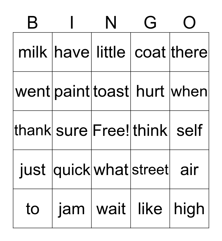This bingo card has a free space and 34 words: green, like, put, children, just, paint, there, to, have, sink, toast, little, spoon, best, think, when, jam, thank, quick, street, what, with, milk, self, wait, high, coat, look, hurt, went, they, sure, air and coin.