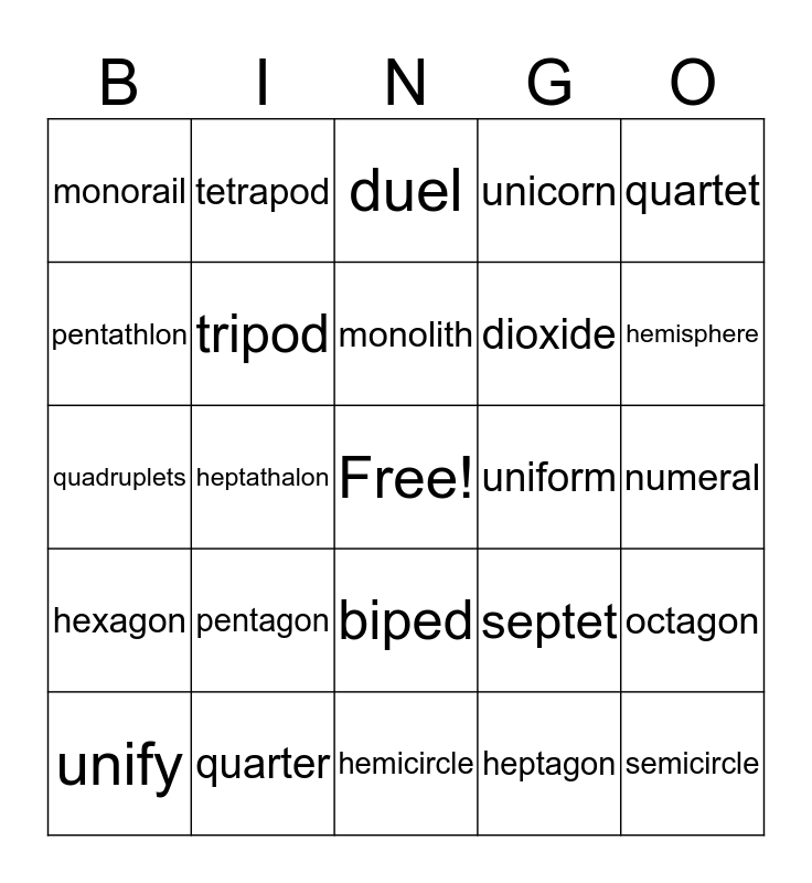 This bingo card has a free space and 34 words: duet, heptagon, bifocals, numberless, hexagon, tripod, quartet, unify, tetrapod, semitrailer, monolith, duel, octave, triad, uniform, hemisphere, quarter, quadruplets, pentagon, septet, biped, demigod, monorail, numeral, hemicircle, semicircle, unicorn, unicycle, dioxide, pentathlon, quadrangle, heptathalon, octagon and October.