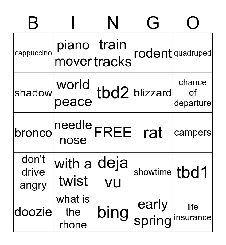 This bingo card has a free space and 29 words: doozie, phil connors, needle nose, flapjacks, cappuccino, train tracks, world peace, with a twist, rat, what is the rhone, campers, life insurance, bing, early spring, chance of departure, french poetry, deja vu, don't drive angry, quadruped, bronco, showtime, donut, blizzard, shadow, rodent, piano mover, tbd1, tbd2 and tbd3.