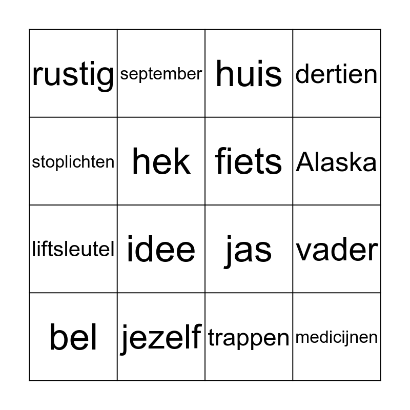 This bingo card has 32 words: plan, school, vader, jongen, medicijnen, fiets, stoplichten, kinderen, september, gezichten, Alaska, huis, wakker, internet, jezelf, gevangenis, lafaard, jas, zwart, vakantie, mobieltjes, bang, trappen, blij, bel, dertien, liftsleutel, hek, rustig, seconde, leugenaars and idee.