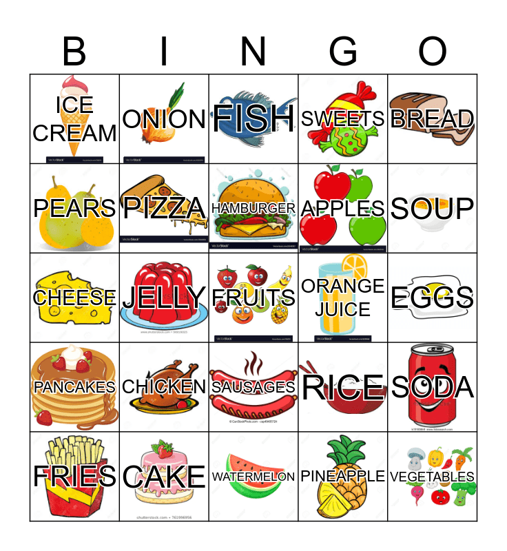 This bingo card has 30 images and 30 words: CAKE, MASHED POTATOES, JELLY, HAM, ICE CREAM, FISH, PIZZA, SAUSAGES, ORANGE JUICE, WATERMELON, EGGS, FRUITS, PINEAPPLE, VEGETABLES, SOUP, MILK, RICE, PANCAKES, CHICKEN, BREAD, CHEESE, SALAD, ONION, APPLES, PEARS, SWEETS, SODA, FRIES, HAMBURGER and COOKIES.