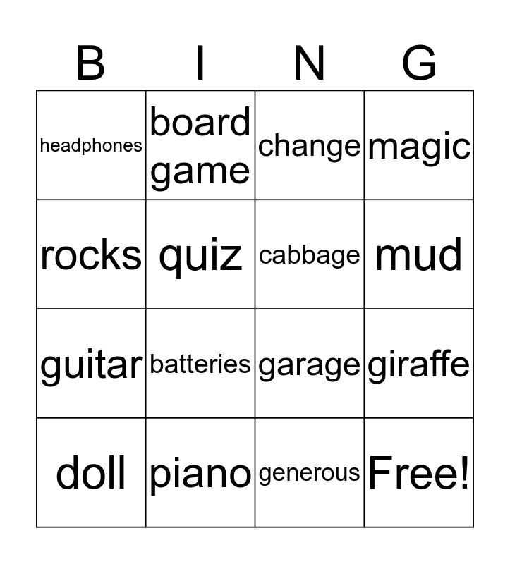 This bingo card has 23 words: Free!, camera, mud, necklace, rocks, headphones, quiz, board game, doll, robot, batteries, guitar, weird, coincidence, piano, giant, change, garage, cabbage, giraffe, magic, generous and chapattis.