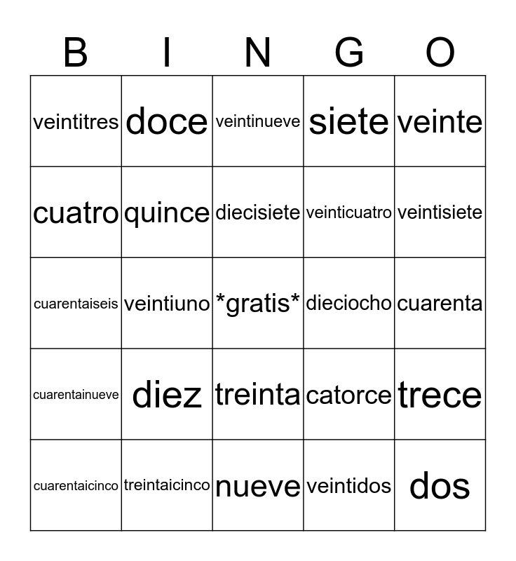 This bingo card has a free space and 50 words: uno, dos, ocho, nueve, diez, seis, doce, tres, cuatro, cinco, quince, siete, trece, catorce, once, dieciseis, diecisiete, dieciocho, diecinueve, veinte, veintiuno, veintidos, veintitres, veinticuatro, veinticinco, veintiseis, veintisiete, veintiocho, veintinueve, treinta, treintaiuno, treintaidos, treintaitres, treintaicuatro, treintaicinco, treintaiseis, treintaisiete, treintaiocho, treintainueve, cuarenta, cuarentaiuno, cuarentaidos, cuarentaitres, cuarentaicuatro, cuarentaicinco, cuarentaiseis, cuarentaisiete, cuarentaiocho, cuarentainueve and cincuenta.