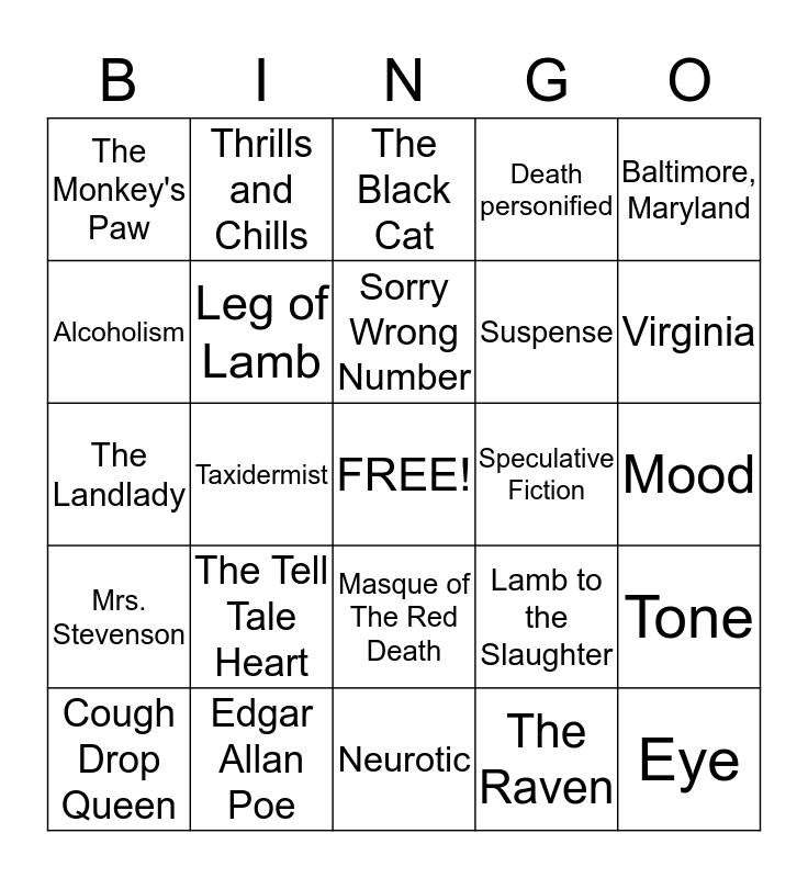 This bingo card has a free space and 24 words: The Tell Tale Heart, Edgar Allan Poe, Sorry Wrong Number, Cough Drop Queen, Baltimore, Maryland, The Monkey's Paw, Alcoholism, Thrills and Chills, Speculative Fiction, Masque of The Red Death, Suspense, The Landlady, Lamb to the Slaughter, Tone, Leg of Lamb, The Raven, Mood, The Black Cat, Virginia, Taxidermist, Eye, Mrs. Stevenson, Death personified and Neurotic.
