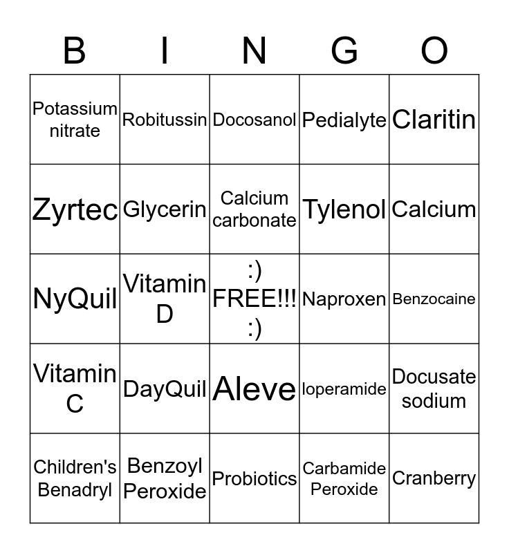 This bingo card has a free space and 24 words: DayQuil, Benzoyl Peroxide, Calcium carbonate, Children's Benadryl, Claritin, Potassium nitrate, Zyrtec, Robitussin, Naproxen, Aleve, Tylenol, NyQuil, loperamide, Docusate sodium, Glycerin, Carbamide Peroxide, Benzocaine, Docosanol, Calcium, Vitamin D, Cranberry, Vitamin C, Pedialyte and Probiotics.
