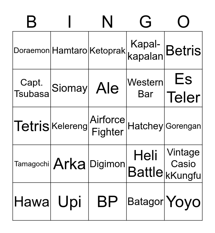 This bingo card has a free space and 24 words: Arka, Upi, Ale, Hawa, Betris, Doraemon, Capt. Tsubasa, Hamtaro, Hatchey, Digimon, Western Bar, Tetris, Heli Battle, Vintage Casio kKungfu, Siomay, Batagor, Gorengan, Ketoprak, Es Teler, Kelereng, Yoyo, Tamagochi, Kapal-kapalan and BP.