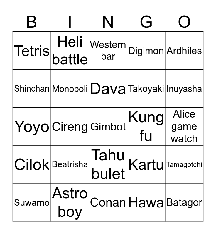 This bingo card has a free space and 24 words: Suwarno, Beatrisha, Dava, Hawa, Ardhiles, Tetris, Heli battle, Western bar, Kung fu, Alice game watch, Yoyo, Monopoli, Kartu, Tamagotchi, Shinchan, Astro boy, Conan, Digimon, Inuyasha, Cilok, Cireng, Tahu bulet, Takoyaki and Batagor.