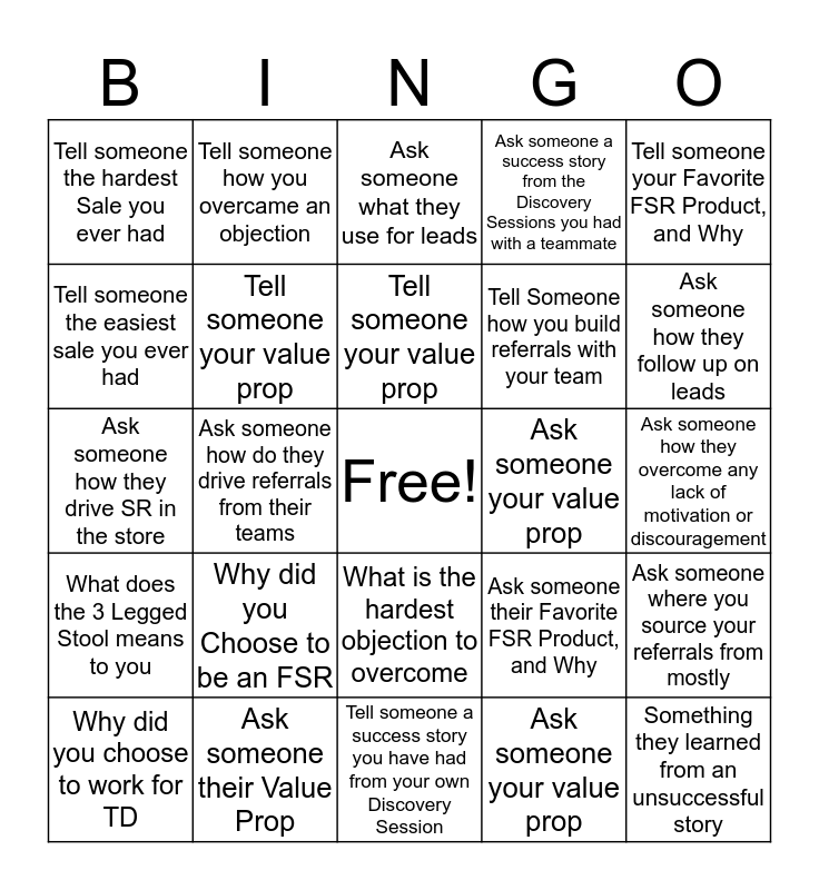 This bingo card has a free space and 24 words: Why did you Choose to be an FSR, Ask someone their Value Prop, Tell someone your value prop, Why did you choose to work for TD, Tell someone your Favorite FSR Product, and Why, Tell someone the hardest Sale you ever had, Tell someone the easiest sale you ever had, Tell someone how you overcame an objection, Ask someone your value prop, What is the hardest objection to overcome, Tell Someone how you build referrals with your team, Ask someone how they drive SR in the store, Ask someone their Favorite FSR Product, and Why, Ask someone where you source your referrals from mostly, Tell someone your value prop, Ask someone your value prop, Ask someone how they overcome any lack of motivation or discouragement, Ask someone what they use for leads, Ask someone how they follow up on leads, Ask someone how do they drive referrals from their teams, Something they learned from an unsuccessful story, What does the 3 Legged Stool means to you, Ask someone a success story from the Discovery Sessions you had with a teammate and Tell someone a success story you have had from your own Discovery Session.