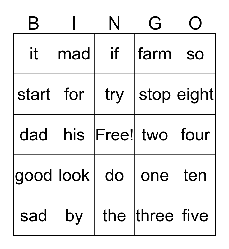 This bingo card has a free space and 31 words: the, this, his, is, it, if, for, one, two, three, four, five, six, seven, eight, nine, ten, look, good, do, so, glad, sad, mad, stop, start, farm, dad, by, try and mother.
