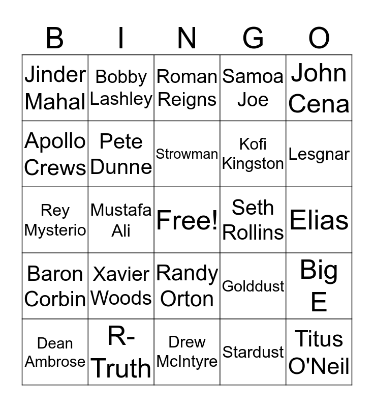 This bingo card has a free space and 24 words: Xavier Woods, R-Truth, Strowman, Dean Ambrose, John Cena, Jinder Mahal, Apollo Crews, Bobby Lashley, Seth Rollins, Randy Orton, Kofi Kingston, Rey Mysterio, Golddust, Big E, Pete Dunne, Stardust, Elias, Roman Reigns, Lesgnar, Mustafa Ali, Titus O'Neil, Baron Corbin, Samoa Joe and Drew McIntyre.