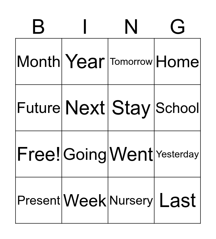 This bingo card has 20 words: Yesterday, Today, Tomorrow, Past, Present, Future, Week, Month, Free!, Year, Going, Went, Next, Last, Stay, Lymm, School, Home, Nursery and Shop.