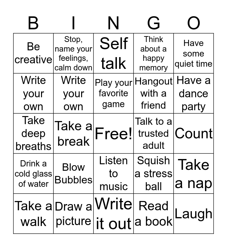 This bingo card has a free space and 24 words: Blow Bubbles, Draw a picture, Play your favorite game, Take a walk, Have some quiet time, Be creative, Write your own, Stop, name your feelings, calm down, Talk to a trusted adult, Listen to music, Hangout with a friend, Take deep breaths, Squish a stress ball, Take a nap, Write your own, Read a book, Count, Self talk, Have a dance party, Take a break, Laugh, Drink a cold glass of water, Think about a happy memory and Write it out.