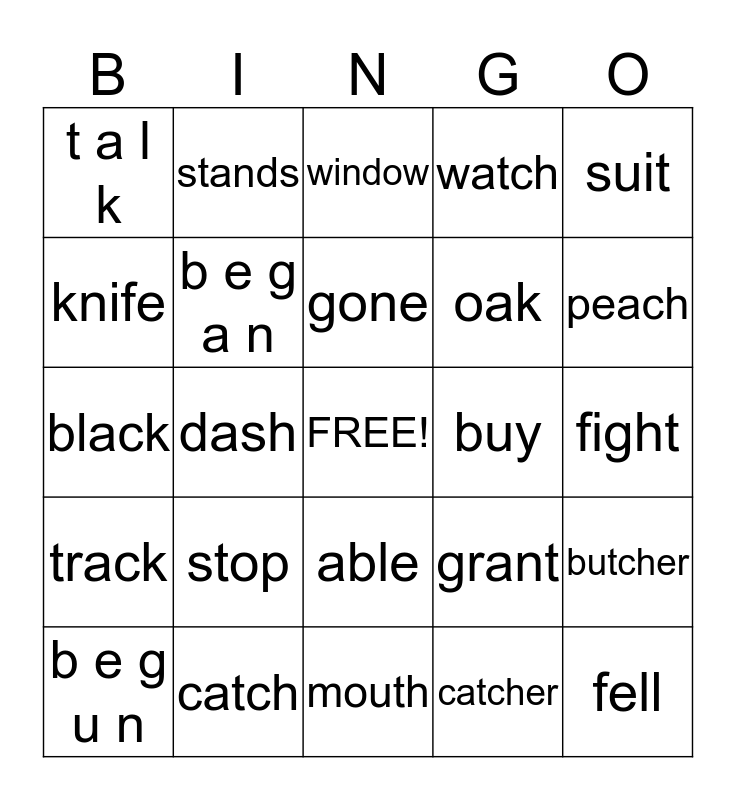 This bingo card has a free space and 39 words: clothing, clothe, b e g i n, b e g a n, b e g u n, able, gone, done, suit, track, dash, watch, fell, fight, buy, stop, w a l k, t a l k, b a l k, grant, knife, mouth, oak, peach, pole, queen, rope, season, space, stands, wagon, wheat, window, catch, catcher, kitchen, butcher, black and warm.