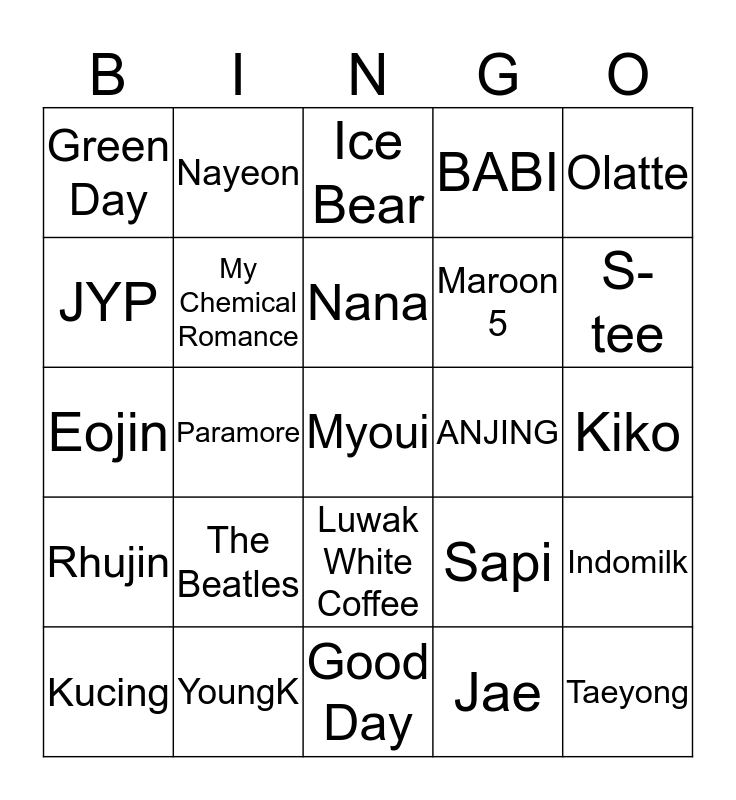 This bingo card has a free space and 24 words: The Beatles, YoungK, Nana, Kucing, Olatte, Green Day, JYP, Nayeon, ANJING, Luwak White Coffee, Maroon 5, Eojin, Sapi, Indomilk, My Chemical Romance, Jae, Kiko, Ice Bear, S-tee, Paramore, Taeyong, Rhujin, BABI and Good Day.