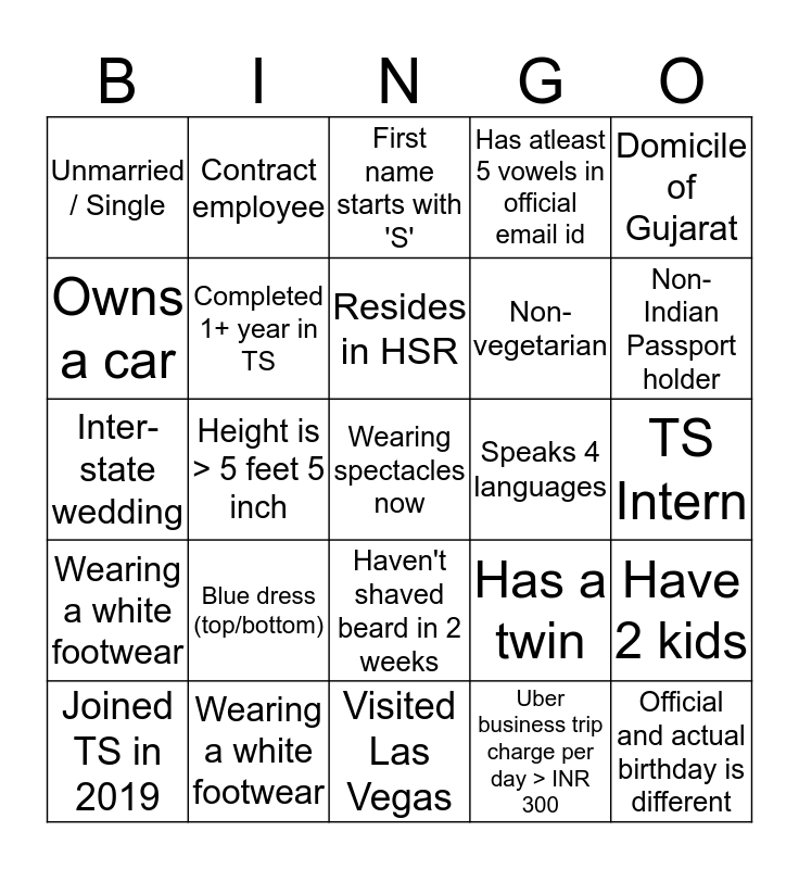 This bingo card has 25 words: Blue dress (top/bottom), Visited Las Vegas, Resides in HSR, Joined TS in 2019, Domicile of Gujarat, Unmarried / Single, Owns a car, Contract employee, Speaks 4 languages, Haven't shaved beard in 2 weeks, Non-vegetarian, Inter-state wedding, Has a twin, Have 2 kids, Completed 1+ year in TS, Official and actual birthday is different, TS Intern, First name starts with 'S', Non-Indian Passport holder, Height is > 5 feet 5 inch, Wearing spectacles now, Wearing a white footwear, Wearing a white footwear, Has atleast 5 vowels in official email id and Uber business trip charge per day > INR 300.