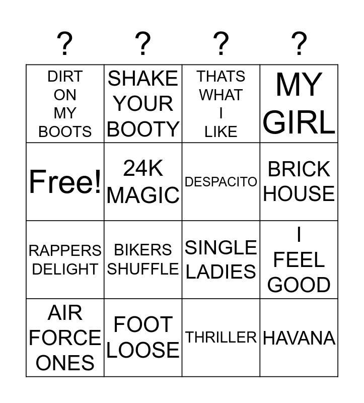 This bingo card has 16 words: FOOT LOOSE, I FEEL GOOD, THATS WHAT I LIKE, DIRT ON MY BOOTS, RAPPERS DELIGHT, SHAKE YOUR BOOTY, SINGLE LADIES, THRILLER, Free!, 24K MAGIC, AIR FORCE ONES, MY GIRL, BIKERS SHUFFLE, BRICK HOUSE, DESPACITO and HAVANA.
