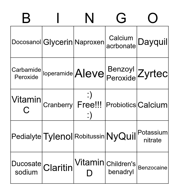 This bingo card has a free space and 24 words: Tylenol, Claritin, Aleve, Ducosate sodium, Dayquil, Docosanol, Carbamide Peroxide, Glycerin, Probiotics, Robitussin, Benzoyl Peroxide, Vitamin C, NyQuil, Potassium nitrate, loperamide, Children's benadryl, Calcium, Naproxen, Zyrtec, Cranberry, Benzocaine, Pedialyte, Calcium acrbonate and Vitamin D.