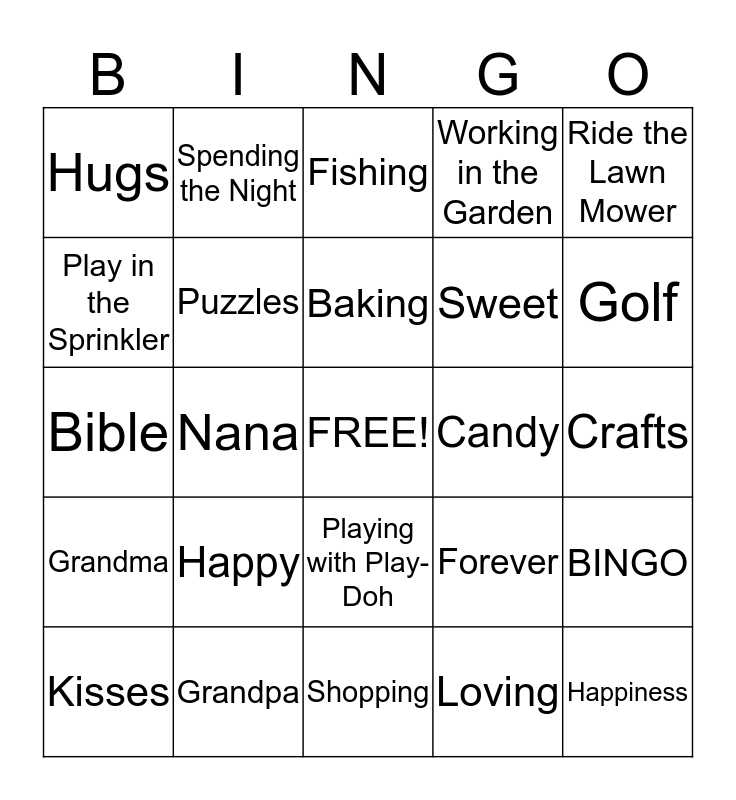 This bingo card has a free space and 29 words: Love, Grandpa, Fishing, Holidays, Ride the Lawn Mower, Hugs, Puzzles, Baking, Candy, BINGO, Kisses, Nana, Loving, Happiness, Bible, Amazing, Shopping, Forever, Golf, Grandma, Happy, Papa, Sweet, Crafts, Play in the Sprinkler, Spending the Night, Playing with Play-Doh, Working in the Garden and Go to the Movies.